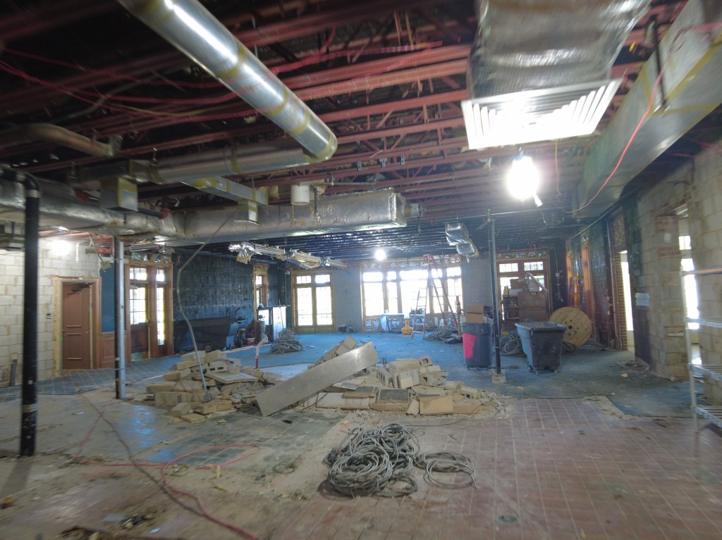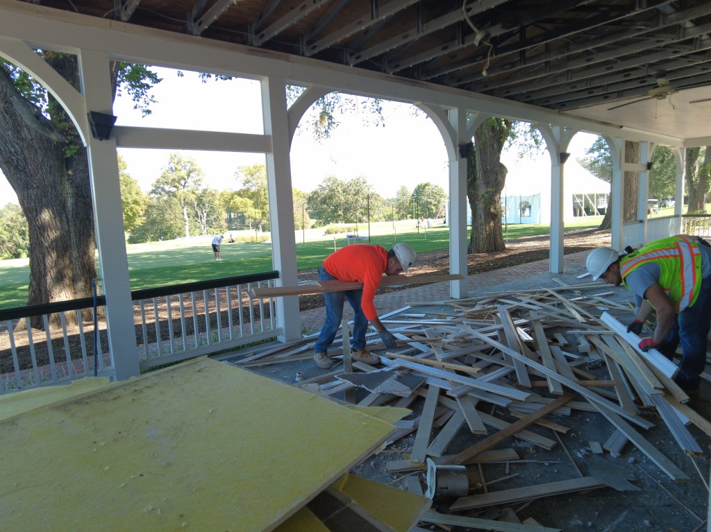 The inside of the clubhouse has seen more walls and ceilings being taken down in the Terrace, Card, and Tap Rooms. The kitchen flooring was torn up little by little to make way for new flooring. Demolition has begun on the porches with the ceiling paneling coming down. We are excited to see how the rest of demolition will go!
