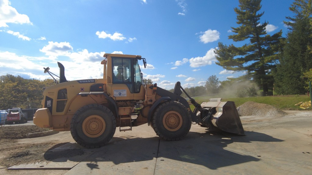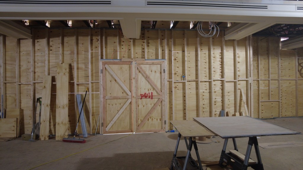 The construction crew has begun digging into the basement, which will be the foundation for the clubhouse addition. The temporary wall in the Terrace Room is complete and can be seen from the outside of the building. Additionally, the demolition of the area, which will eventually be the new loading dock.