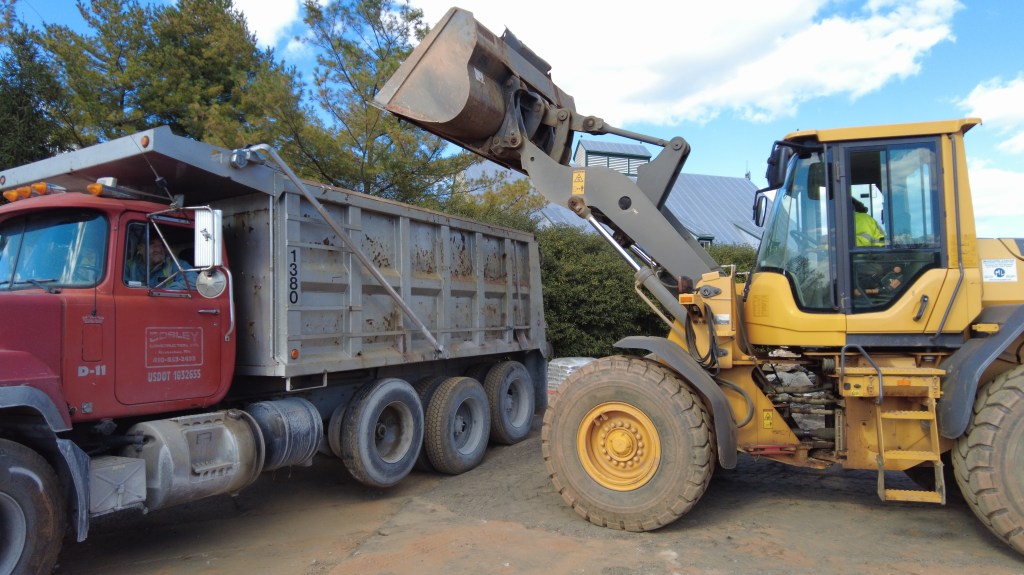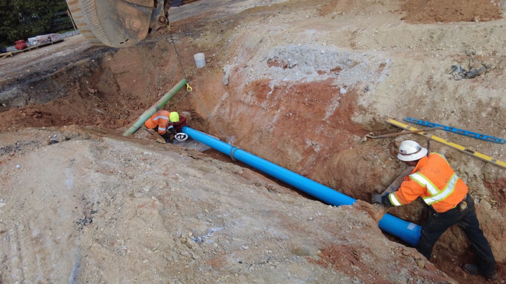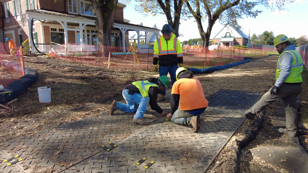 The construction crew completed installing the new water line up to the side of the clubhouse and for the future addition! After the air excavation on the other side of the clubhouse was finished, an access road was installed to allow temporary road access for construction trucks. Additionally, more temporary walls have been added to support the building foundation for the subsequent construction steps.