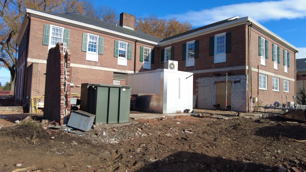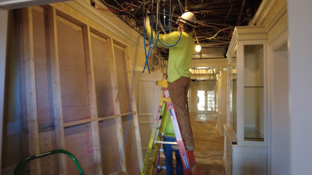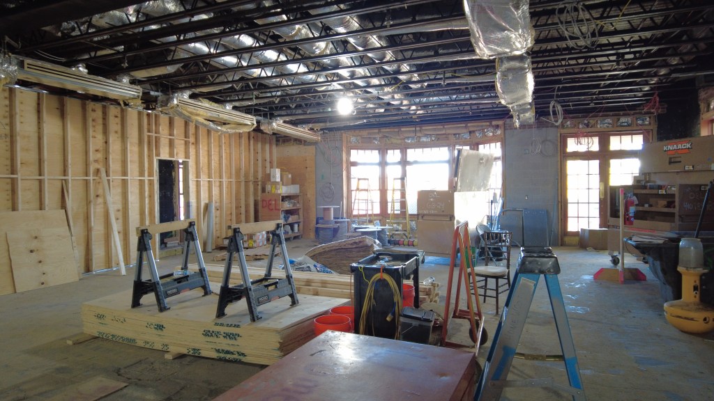 The construction crew has put up a temporary wall in the Tap Room, which allows them to take down the back wall and extend the dining space without impacting the rest of the building. In addition, demolition has begun in the Gentlemen’s Locker Room, the future accessway to the rooftop terrace, and the old loading dock wall was knocked down. They also completed the service testing for the new water lines.