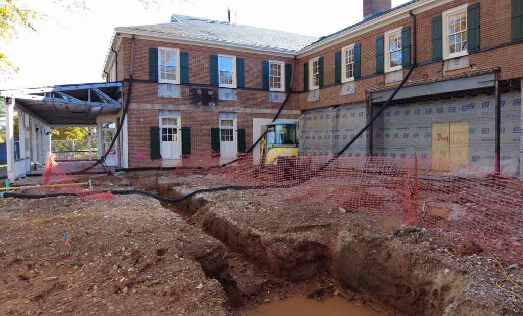 The construction crew has started twisting helical piles into the ground where the East Terrace Room will be. Helical piles are round hollow shafts or square solid shafts coming from steel. They provide foundational support for large structures and are embedded at least 25 to 30 feet into the ground to disperse the weight which will sit on top of them. The structure and spacing of these piles will support the concrete and foundation of this room.