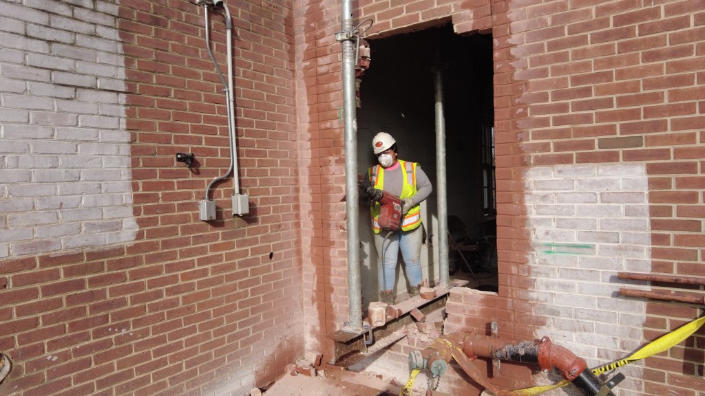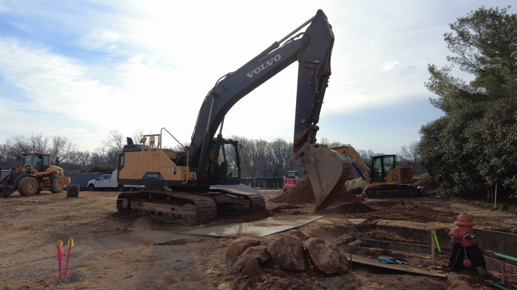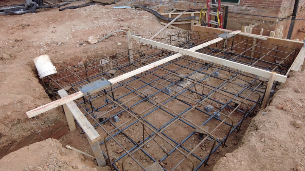 The construction crew has rebarred the footings, waterproofed, and formed the columns for the new basement addition. These things will make way for pumping concrete into the columns and building the basement walls. In addition, they have completed the helical pile installation and placed pile caps for the Main Grill Dining area to make way for concrete slabs. They also are installing the new sewer and storm lines and tearing down the brick for the new mechanical storage door.