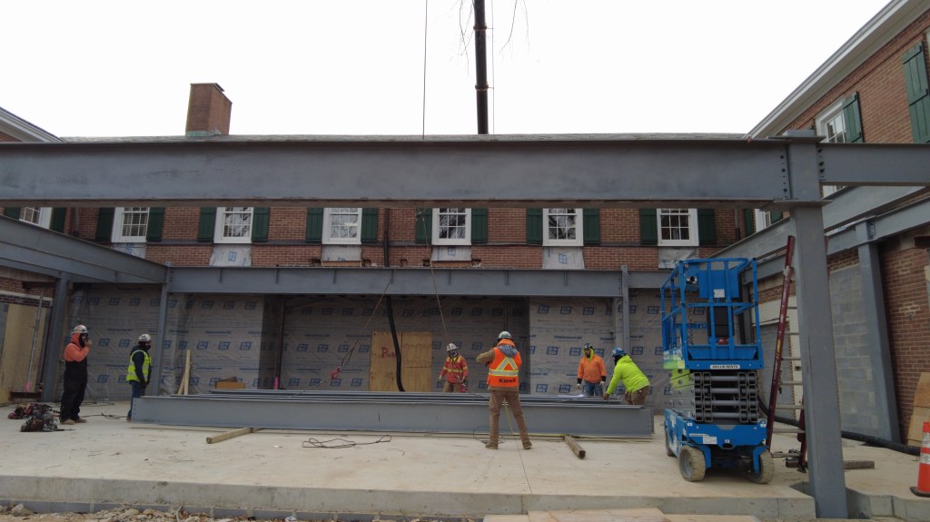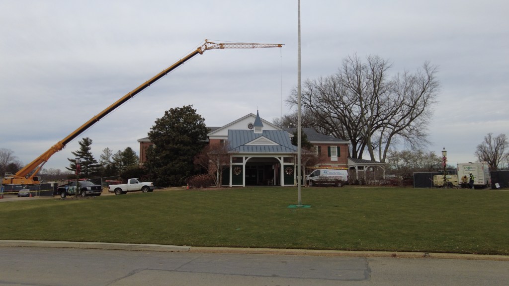 The most significant change was the steel delivery for the second floor of the clubhouse! They have begun to construct the steel framing above the East Terrace Room with a large crane. The crane truck is on the other side of the clubhouse to protect the integrity of the iconic Elm trees. It is impressive to see the coordination and communication of the crew for the steel beam installation since the crane operator cannot see over the building. Additionally, they have begun to set the new steel at the Trophy Bar opening.