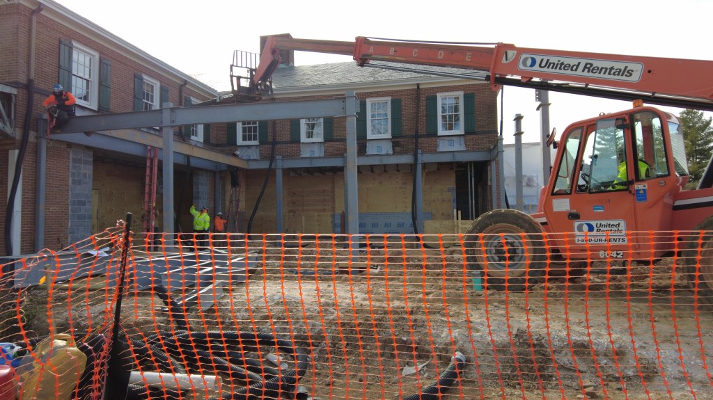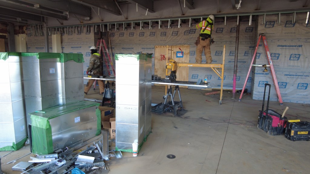 The construction crew has erected the structural steel framing for the Main Grill Dining area! In addition, the mason has completed the elevator shaft for the addition area and will begin building the stairwell wall, which will help support the future Rooftop Terrace. They have also continued placing the loading dock footings. Additionally, underground excavation has begun for installing the new transformer. Finally, the construction crew continued to install the ductwork in the East Terrace Room, placed wire mesh on the kitchen floor to reduce concrete surface cracking, and constructed bulkhead framing for the ceiling to connect everything from the kitchen to the East Terrace Room for a seamless finish!