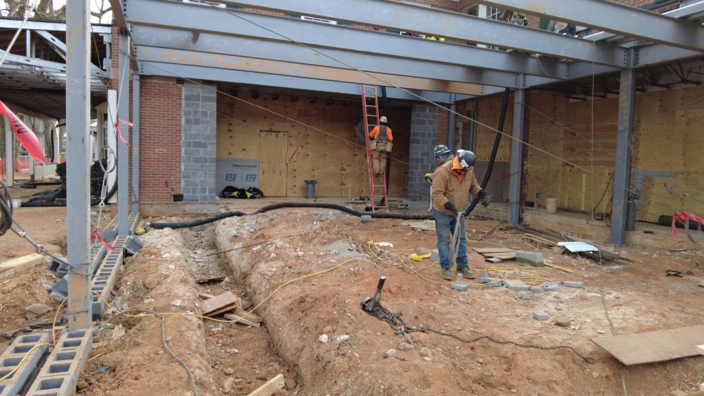 The construction crew has almost finished the steel structural framing on the outside of the clubhouse. The addition has seen a great deal of progress since the extended basement is now enclosed, which will help the construction move forward on the top two floors. This space will include the Foyer & Golfer’s Entry, two new restrooms, and the Rooftop Terrace stairwell. The construction crew has also been working on interior wall framing throughout, pouring the topping slab in the kitchen, and digging underground to install the power feed duct bank, which has cables that will connect to the new transformer giving power to the entire building.
