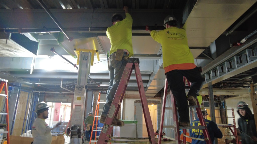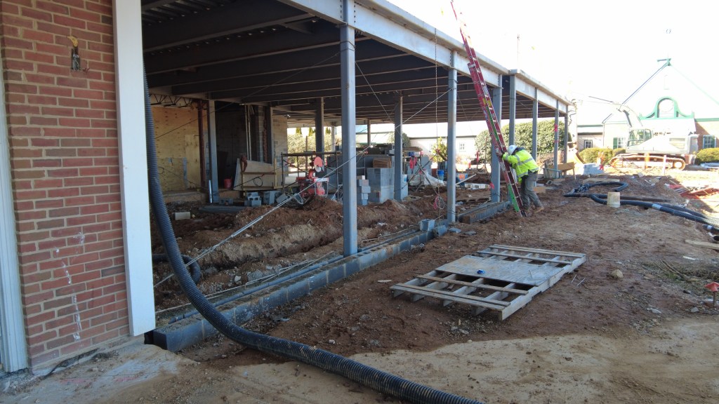 The construction crew has enclosed the East Terrace Room, so it is now part of the interior of the building. The chimney installation has begun in the Main Grille Dining and Outdoor Patio areas. The construction crew continued ductwork installation throughout the clubhouse and the wall erection at the loading dock. In addition, they have placed and smoothed the concrete for the upper-level terraces and begun the wall layout in the basement addition. Finally, the dishwashing station in the kitchen has seen rough-in plumbing for future water supply lines.