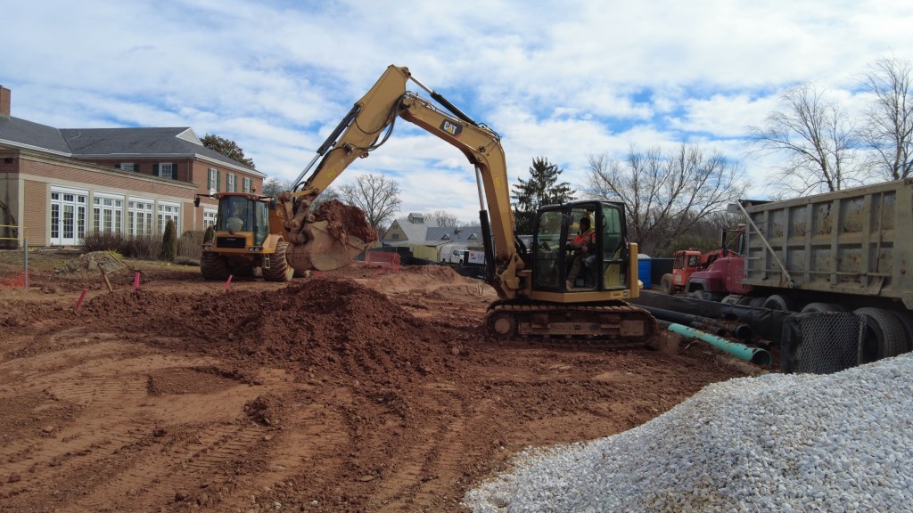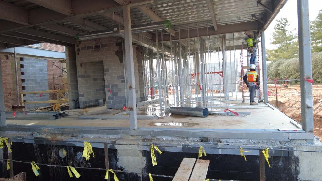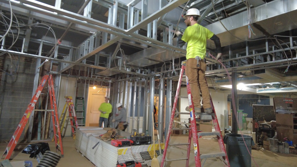 The construction crew has fabricated the exterior wall framing for the new Foyer and Golfer’s Entry, along with the new access to the Wine Room addition. The chimney between the Main Grille and Outdoor Patio areas is well underway. They had to cut access into the second level of the building to for the chimney access. Ductwork and electrical installation in the process of being installed.