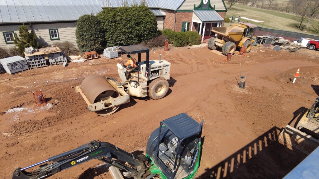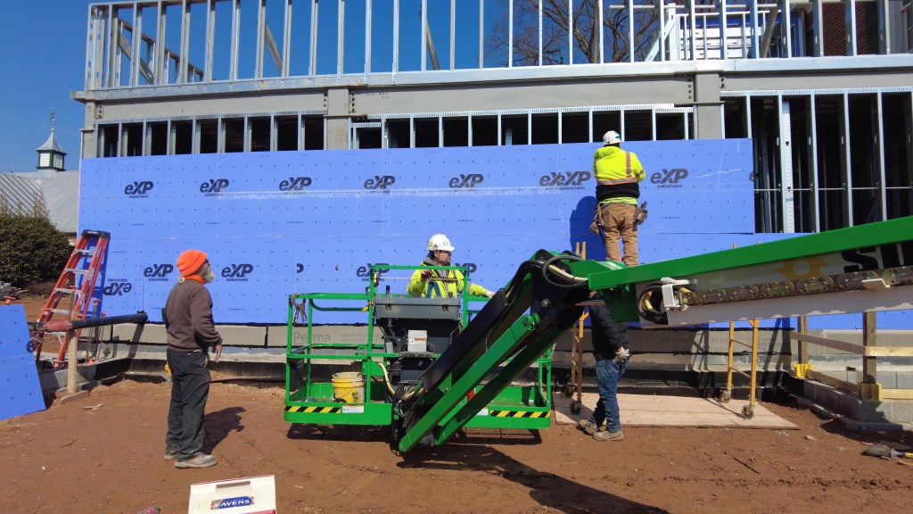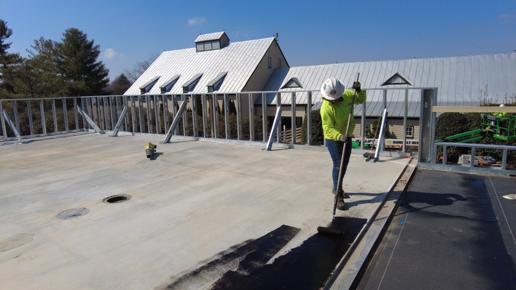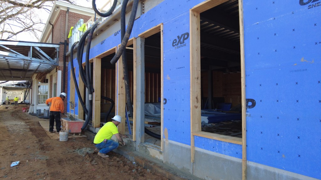 The construction crew has installed flat roofing on the Rooftop Terrace to protect the addition from the outside elements until the rooftop is built. They were also cutting wood to place in the two inches between the existing building and the addition to prevent cracking when the building naturally moves. As for the outside, the exterior wall sheathing is almost complete, which means they can move forward with Styrofoam and brick. The construction crew built the framing for windows and doors in the additional areas of the clubhouse and began pouring the concrete for the porches. Finally, the existing building has been inspected, which means drywall will be going up soon!