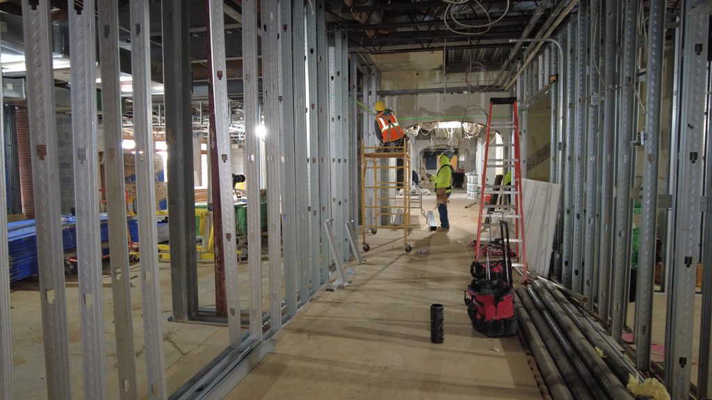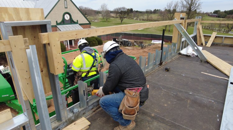 The crew opened up the wall between the Trophy Bar and the Main Grille Dining area in the clubhouse interior, which is now one open space. Next, they continued to build interior wall framing for the Main Grille Dining and Wine Room areas and install the drywall in the East Terrace and Trophy Bar areas. Finally, they placed plywood on the kitchen walls as the first step of walling.