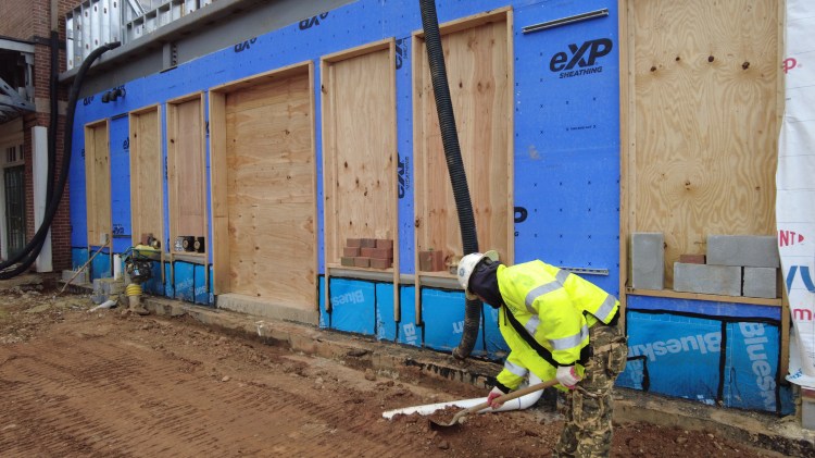The construction crew has completed building the parapet wall framing and started to install the plywood walls. They poured and smoothed the concrete for the Outdoor Patio and the area outside the East Terrace Room. In addition, they closed the windows and door framing outside the building for protection from the weather. The construction crew continued to lay the brick for the clubhouse addition.