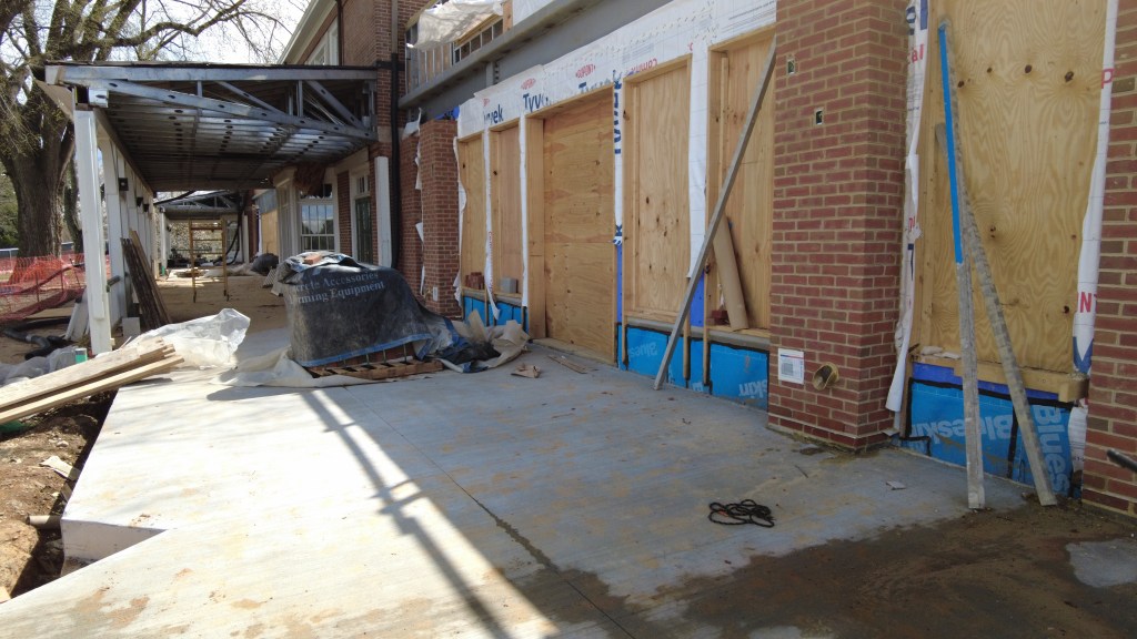 The crew has built the wall framing on the Rooftop Terrace to differentiate the occupied terrace from the unoccupied spaces. In addition, they completed the bricklaying for the clubhouse addition. Next, they poured and smoothed the concrete for the area outside the Main Grille Dining room. The construction crew also dug into the ground to start the installation of a new gas service pipe. They have sprayed installation on the Outdoor Patio ceiling to maintain the R-value. Finally, they continued to install drywall and plywood in the clubhouse’s interior.