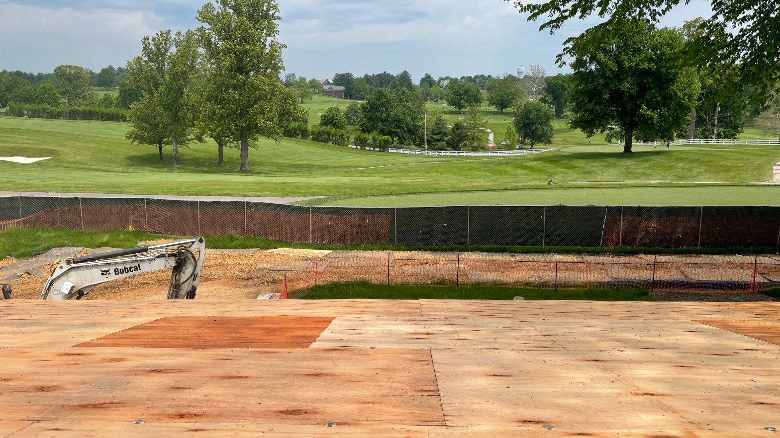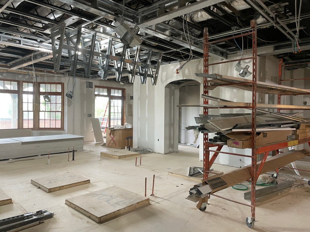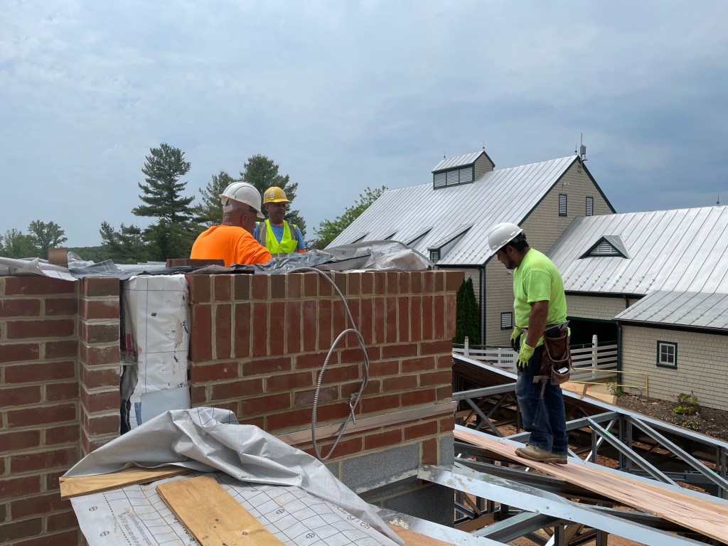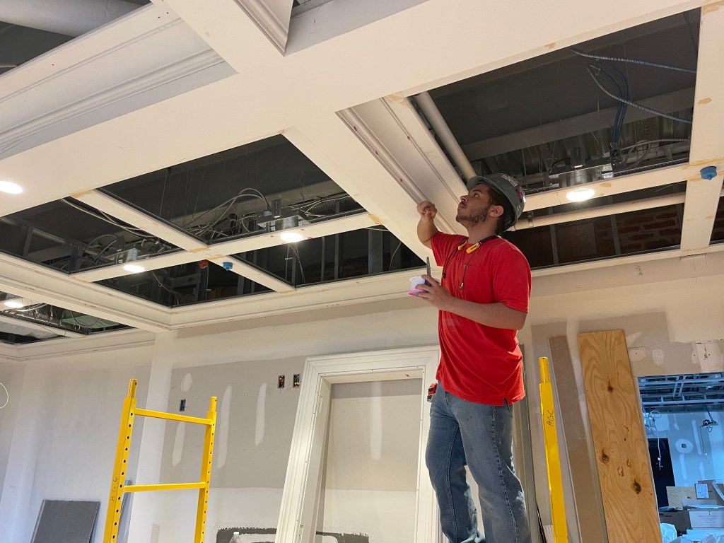The construction crew has started installing the roof sheathing, a layer of wood boards between the trusses and the final roofing. They also worked on the permanent roofing for the unoccupied terraces. In addition, the crew laid the brickwork for the loading dock. Other exterior updates included finishing ceiling framing for the Adirondack Bar, continuing the pavers’ demo, and starting the clean-up. As for the clubhouse interior, the Trophy Bar has seen exciting changes, including erecting the trophy wall and framing for the TVs. Finally, they have worked on the electrical rough-in, ductwork, and trim work throughout the clubhouse.
