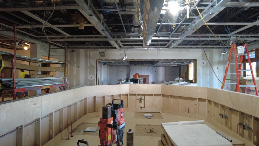 As for the clubhouse exterior, the construction crew has started to build the last wall for the loading dock. They have continued to build the trim for the roofing. In the Adirondack Bar, they worked on the rough-ins for lighting and fans. Finally, the crew began the installation of the new herringbone brick paved walkway.