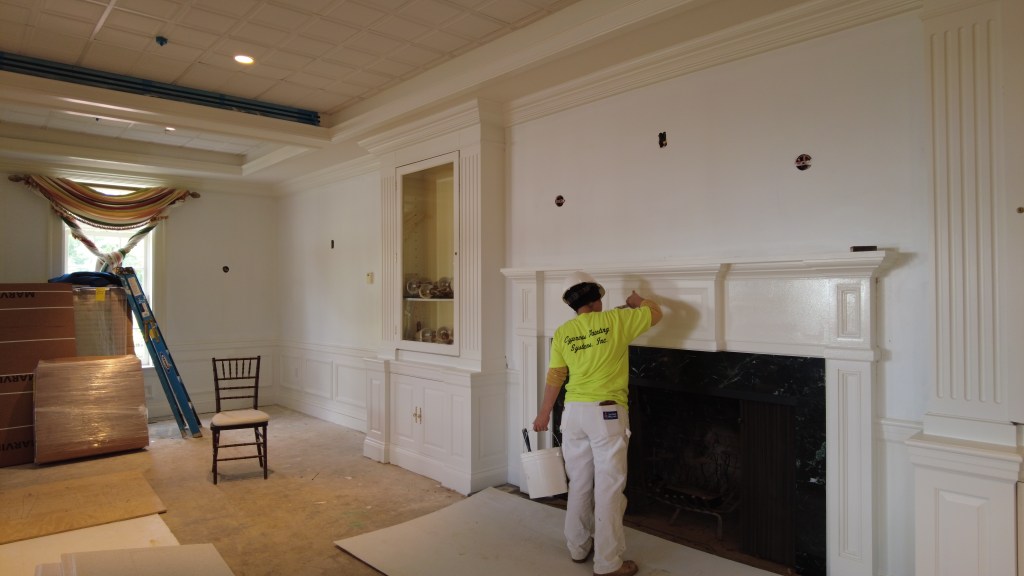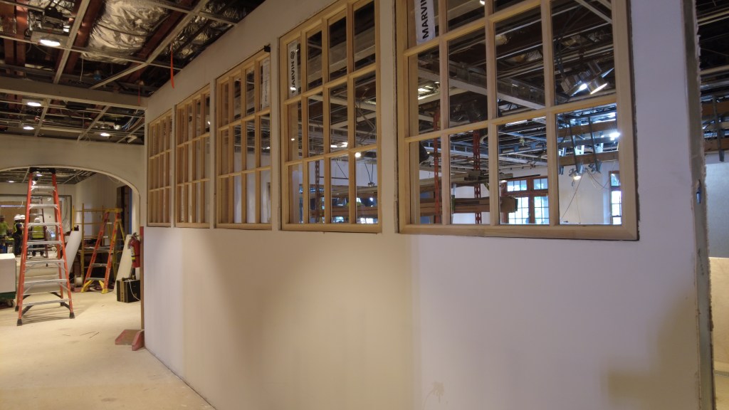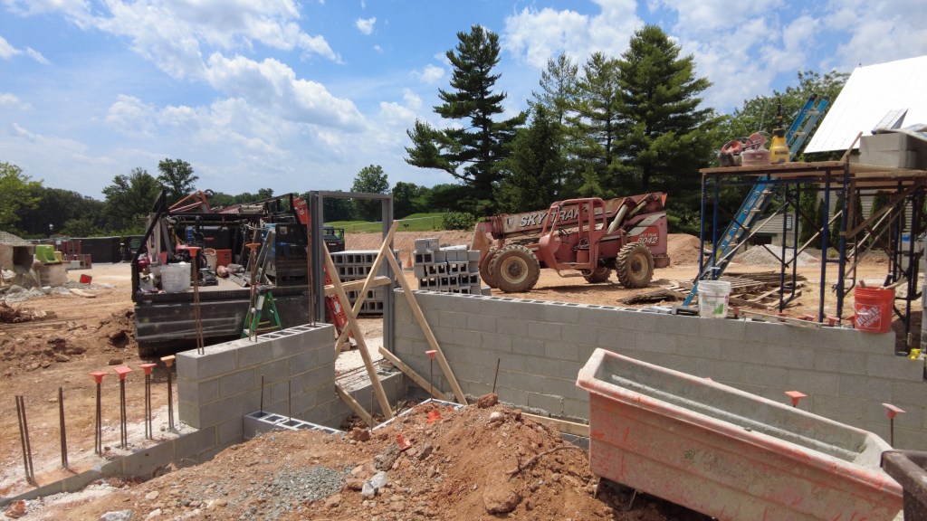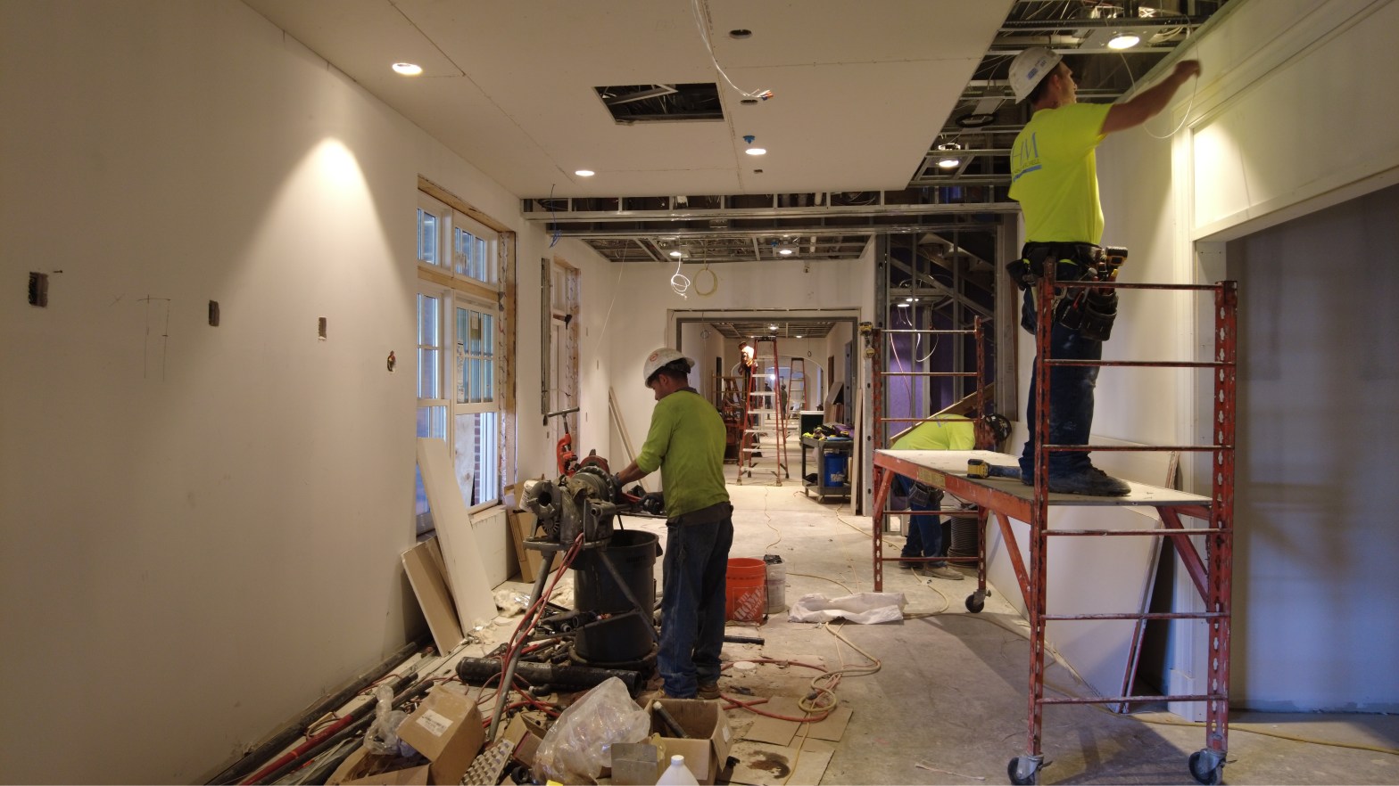 The construction crew has started to close the ceilings with drywall, install windows, and paint walls throughout the clubhouse. They have built scaffolding to start hanging drywall at the top of the stairs to the Rooftop Terrace. Other interior changes include dropping the ceilings in the hallway and Tilly Room and installing the bypass doors between the Oak and Elm Rooms. As for the clubhouse exterior, the construction crew has begun to build the masonry for the last loading dock wall. Finally, they continued work on the roof trim and worked on irrigation sleeves for landscape surfacing in the area near the Golf House.